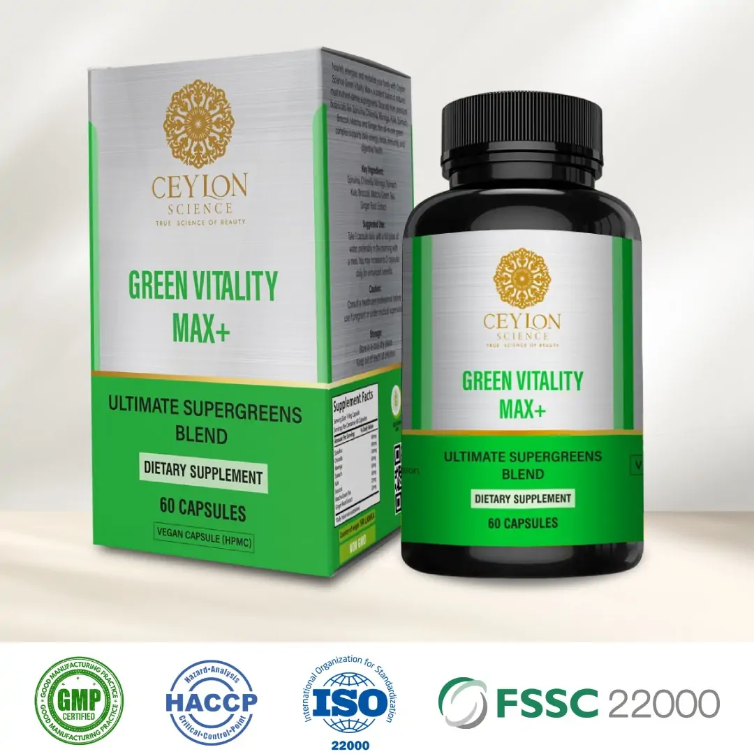 Boost your daily wellness with the powerful plant-based blend of Ceylon Science Green Vitality Max+. Formulated with super greens, antioxidants, vitamins, minerals, spirulina, moringa, wheatgrass, and digestive enzymes, this supplement supports full-body vitality and natural energy levels.